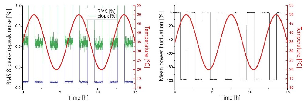 圖1:上左圖:HTCure工藝的激光器在20-50℃溫度擾動下的噪聲表現; 上右圖: HTCure工藝的激光器在20-50℃溫度擾動,及快速開關下的功率穩定性表現。下圖:HTCure工藝的激光器在20-50℃溫度擾動下,指向穩定性的測試數據(< 4 μrad/℃)。