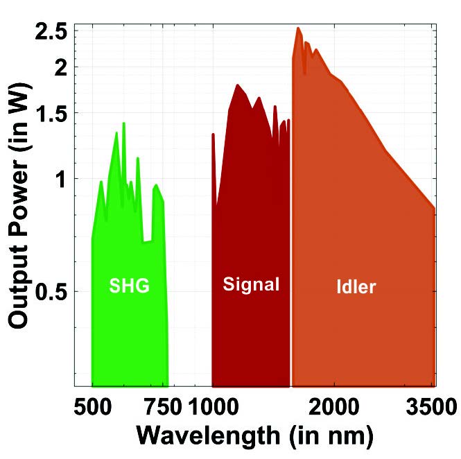 C-WAVE GTR通過兩種非線性過程實現(xiàn)510 – 750 nm, 1020 – 1500 nm, 1.7 – 3.4 μm超寬波段輸出: