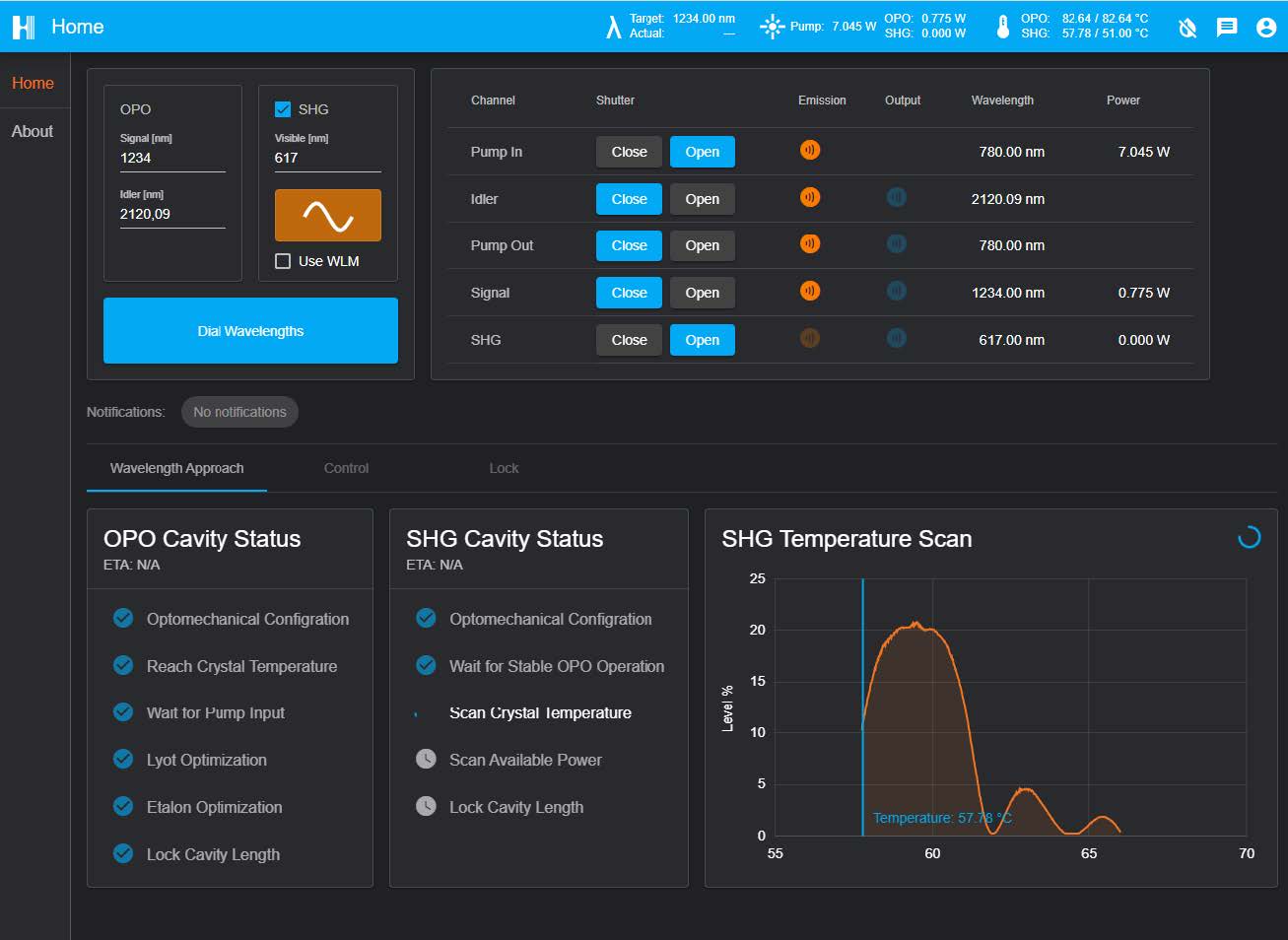 C-WAVE GTR具備多種波長調(diào)節(jié)機制,主要的三種機制為:非線性晶體溫控調(diào)節(jié)(粗調(diào)),腔內(nèi)etalon掃描的準連續(xù)步進調(diào)節(jié),以及采用壓電掃描OPO腔長進行無跳模連續(xù)調(diào)節(jié)。