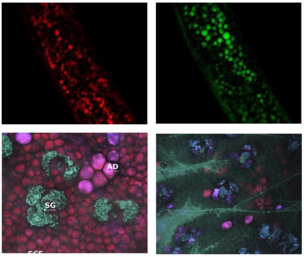 | NOCTUA顯微鏡系統允許在生理相關條件下對結構和事件進行成像,這是熒光標記無法達到的。SRS圖像顯示了秀麗隱桿線蟲中的不飽和脂肪酸和膽固醇(上圖)。下圖顯示了小鼠耳朵皮膚中由脂質形成的真皮結構(左)和局部應用的未標記藥物穿透皮膚(右)。 | ![]() |